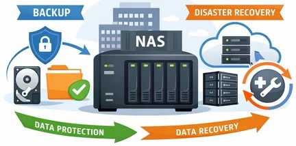 Peran NAS semakin terasa ketika perusahaan menghadapi kondisi darurat atau bencana sistem. Dalam skenario disaster recovery NAS memungkinkan proses pemulihan data dilakukan dengan lebih cepat dan terukur. Data cadangan yang tersimpan secara terpusat dapat digunakan untuk memulihkan sistem tanpa harus membangun ulang dari awal. Dengan konfigurasi yang tepat NAS juga dapat dikombinasikan dengan replikasi ke lokasi lain atau ke cloud sebagai lapisan perlindungan tambahan. Pendekatan ini membantu perusahaan mengurangi risiko downtime berkepanjangan yang dapat berdampak langsung pada operasional dan kepercayaan klien. Disaster recovery yang baik bukan hanya soal pemulihan data tetapi juga tentang kesiapan sistem dalam menghadapi gangguan.